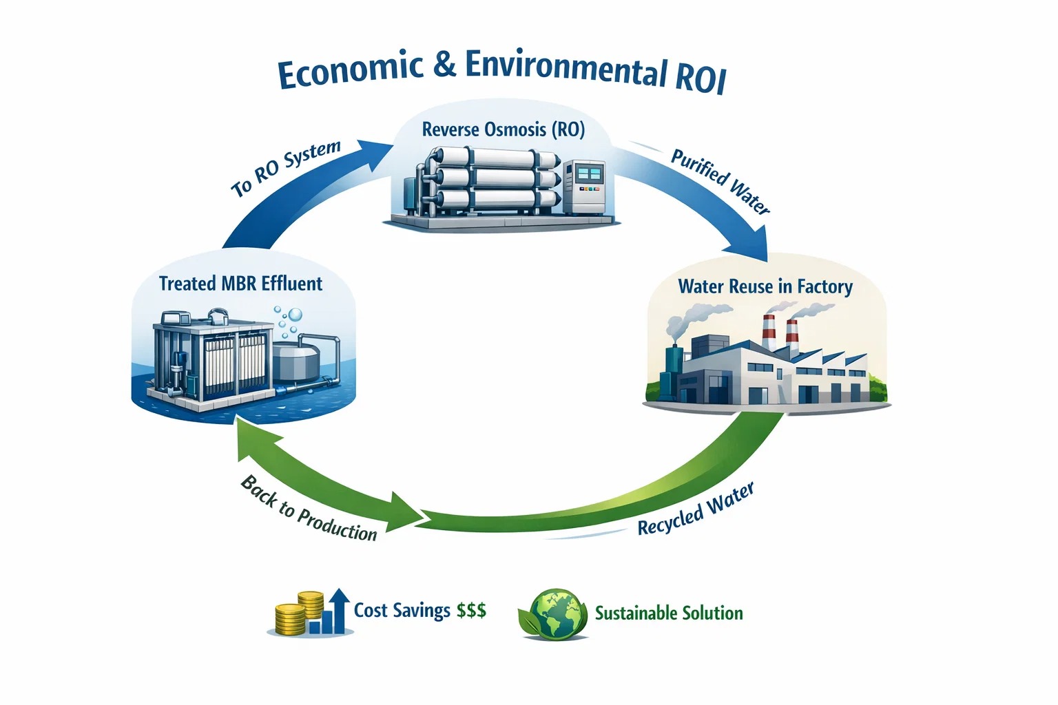 - الادخار: ومن خلال إعادة تدوير 70-80% من المياه المعالجة، يمكن للمحطات توفير مئات الآلاف من الدولارات سنويًا في رسوم شراء المياه وتصريفها.