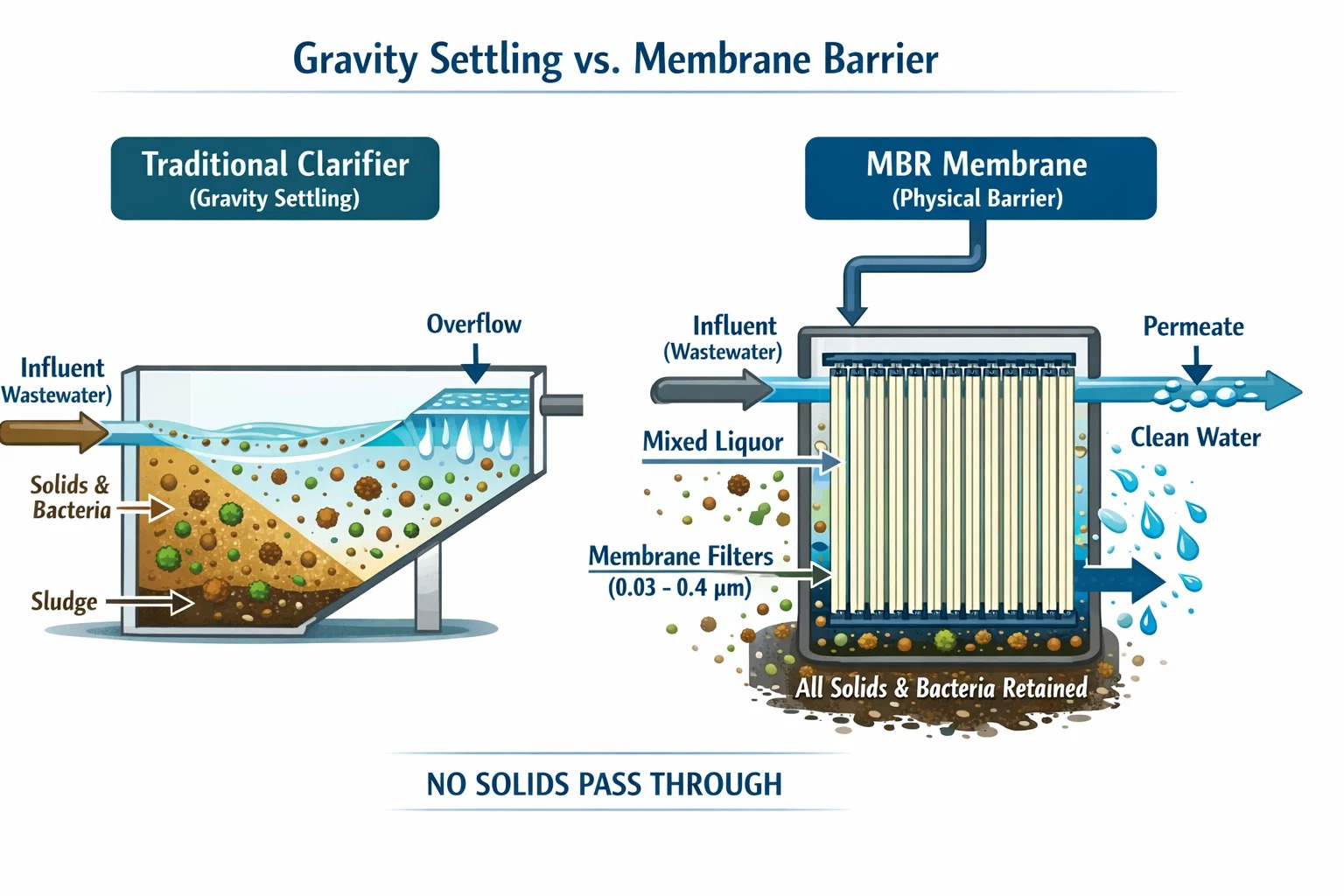 في المصنع التقليدي، أنت مقيد بمدى سرعة غرق الجسيمات. في MBR، نستخدم a حاجز الغشاء المادي (عادة 0.03 إلى 0.4 ميكرومتر).