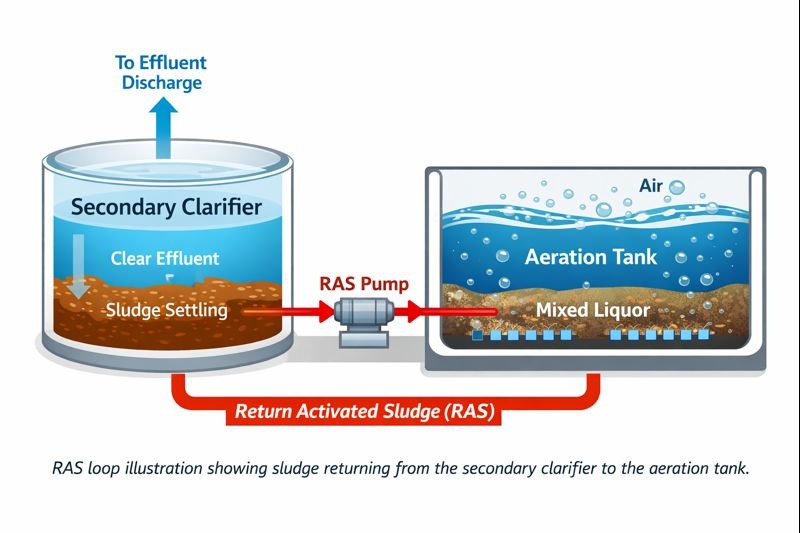 RAS (الحمأة المنشطة العائدة) هي عملية إعادة الحمأة المنشطة المستقرة من جهاز التنقية الثانوي إلى المفاعل البيولوجي.