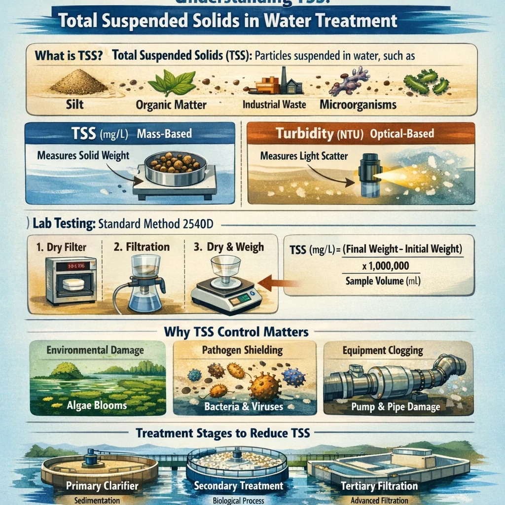 في عالم معالجة المياه، يعد إجمالي المواد الصلبة العالقة (TSS) أحد أهم المعايير لقياس جودة المياه وأداء محطات المعالجة. سواء كنت تدير منشأة بلدية أو نظامًا للمعالجة الصناعية، فإن فهم "ماذا ولماذا وكيف" TSS ضروري للامتثال التنظيمي وحماية البيئة. ما هو خدمات الدعم الفني؟ يشير إجمالي المواد الصلبة العالقة (TSS) إلى الوزن الجاف للجزيئات المحاصرة بواسطة المرشح. وعلى عكس المواد الصلبة الذائبة، فإن هذه الجسيمات كبيرة بما يكفي لرؤيتها أو بقائها معلقة في عمود الماء بسبب الاضطراب. تشمل المكونات الشائعة لـ TSS المواد العضوية والطمي والمنتجات الثانوية الصناعية والكائنات الحية الدقيقة. الفرق الحاسم: TSS مقابل التعكر على الرغم من أن هذين المقياسين يستخدمان غالبًا بالتبادل في المحادثات غير الرسمية، إلا أنهما مختلفان بشكل أساسي: خدمات الدعم التقني (القائم على الكتلة): هذا قياس مادي مباشر للوزن الفعلي للمواد الصلبة. يتم قياسه بالملليجرام لكل لتر (ملجم / لتر). التعكر (البصري): هذا قياس غير مباشر لكيفية تشتت الضوء عند اصطدامه بجزيئات في الماء. يتم قياسه بوحدات التعكر الكلوي (NTU) باستخدام مستشعر الضوء. في حين أن التعكر يوفر نتائج فورية للمراقبة في الوقت الفعلي، فإن TSS يظل "المعيار الذهبي" القانوني لتصاريح التفريغ لأنه يحدد كمية الحمل المادي الذي يتم إطلاقه في البيئة. طريقة المختبر: الإجراء القياسي ولضمان الدقة، تتبع المختبرات عملية صارمة تُعرف باسم الطريقة القياسية 2540D. تعتمد العملية على نهج دقيق لتوازن الكتلة: التحضير: يتم تجفيف مرشح الألياف الزجاجية في فرن عند درجة حرارة 103-105 درجة مئوية، ثم يتم تبريده في مجفف، ويتم وزنه للعثور على الوزن الأولي. الترشيح: يتم سحب حجم مُقاس من عينة مياه الصرف الصحي من خلال الفلتر باستخدام مضخة تفريغ. التجفيف: يتم تجفيف المرشح والمواد الصلبة المحتبسة مرة أخرى عند درجة حرارة 103-105 درجة مئوية حتى يتبخر كل الماء. الوزن النهائي: يتم تبريد المرشح المجفف ووزنه مرة أخرى للعثور على الوزن النهائي. صيغة الحساب: TSS (مجم/لتر) = [(الوزن النهائي بالجرام - الوزن الأولي بالجرام) × 1,000,000] / حجم العينة بالملليلتر لماذا تعتبر إزالة TSS أمرًا حيويًا يمكن أن تؤدي المستويات العالية من TSS في النفايات السائلة إلى عواقب بيئية وتشغيلية خطيرة: التدهور البيئي: تحجب المستويات العالية من المواد الصلبة الذائبة ضوء الشمس في المسطحات المائية الطبيعية، مما يوقف عملية التمثيل الضوئي و"يخنق" الموائل المائية. التدريع الممرض: غالبًا ما تلتصق البكتيريا والفيروسات بالمواد الصلبة العالقة. إذا كانت نسبة TSS مرتفعة، فيمكن لهذه الجسيمات "حماية" الميكروبات من الأشعة فوق البنفسجية أثناء التطهير، مما يؤدي إلى مياه غير آمنة. تلف المعدات: يمكن للمواد الصلبة الزائدة أن تسد الأغشية، وتؤدي إلى تآكل دافعات المضخة، وتؤدي إلى تراكم الحمأة في الأنابيب. استراتيجيات العلاج تستخدم محطات الصرف الصحي الحديثة نهج "الحاجز" متعدد المراحل لتقليل المواد الصلبة العالقة: العلاج الأولي: تسمح مصافي الجاذبية للمواد الصلبة الثقيلة بالاستقرار في القاع. العلاج الثانوي: تعمل العمليات البيولوجية (مثل الحمأة المنشطة) على تحويل النفايات المذابة إلى "كتل" بيولوجية ثقيلة يمكن تسويتها. العلاج الثالثي: يتم استخدام الترشيح الرملي المتقدم، أو مرشحات الوسائط القماشية، أو المواد الكيميائية للتخثير/التلبد لتلميع المياه، مما يؤدي في كثير من الأحيان إلى خفض مستويات المواد الصلبة الذائبة إلى أقل من 5-10 ملجم / لتر. الاستنتاج إن مراقبة خدمات الدعم الفني هي أكثر من مجرد عقبة تنظيمية؛ إنها نافذة على صحة عملية العلاج بأكملها. من خلال موازنة بيانات التعكر في الوقت الفعلي مع التحليل المعملي الدقيق لخدمات الدعم الفني (TSS)، يمكن لمحترفي المياه التأكد من أن تصريف المياه لدينا نظيف وواضح ومتوافق.